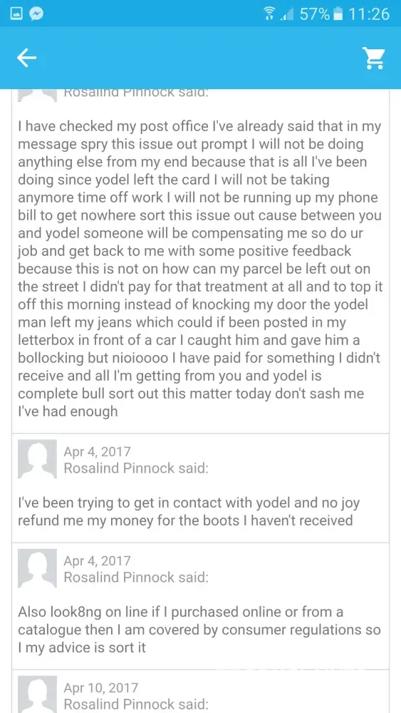 I've ordered a pair of jeans boots from wish however yodel delivered them and left them outside my property and didn't even have the decency to knock my neighbors and leave my parcel there he left it in front of a car when returning home in the evening I seen the card in my letter box went to look outside no parcel so I phoned yodel and explained to them that the parcel wasn't there I've been trying for weeks to get my parcel I tried my neighbors I even contacted the post office in got in touch with wish no joy I tried yodel for them to tell me I have to take it up with wish I filled a complaint and still haven't got anywhere I've emailed wish and I'm being ignored now I paid for my item and delivery charges so there for I'm supposed to get dealt with better than this I've lost days of work my phone bill is high and still I haven't received my item I'm very very disappointed I've spent money with wish for them to deal with me like this all the emailing I'm emailing nobody is responding to me and I'm sorry but I want my money back and compensated to