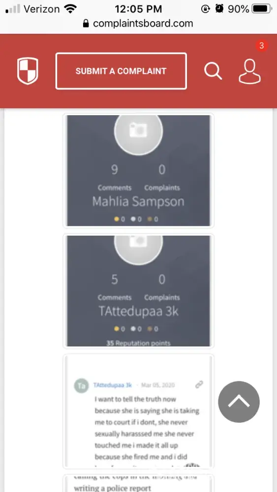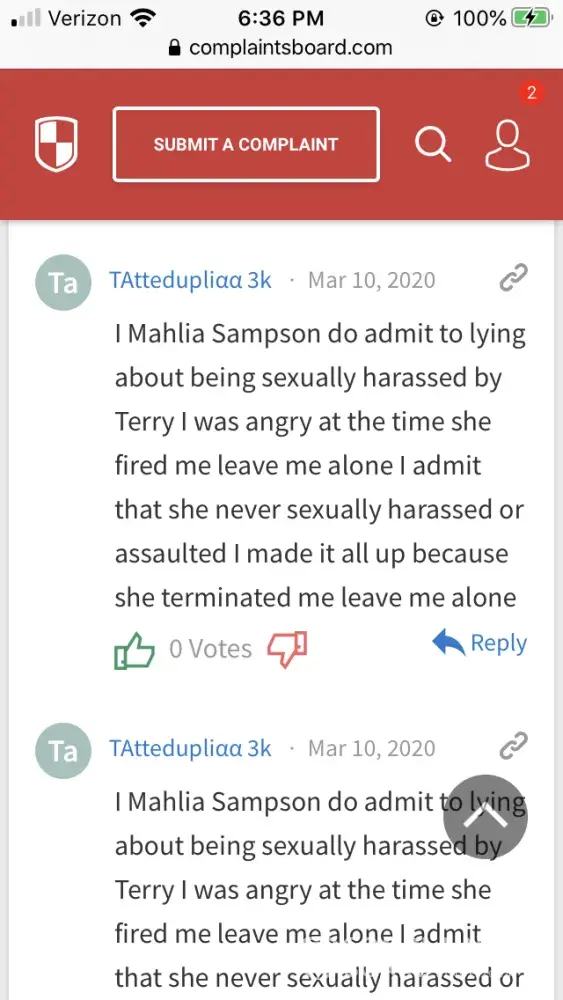 This is I mahlia rejae Sampson everything I said in my first original statement was true the fake account ms terry made which was TAttedupLiaa 3kx was not me she now has changed it to tattedupaa3k and keeps changing the name and I had an original statement I wrote on an account that I lost my password to it says at the bottom of that statement that I mahlia rejae Sampson did write that statement and now she is using that account name that I lost the password to which is mahlia Sampson to try to pretend to be me and say and deny that she didn't touch me when I already said that she DID touch me multiple times and that I was never ever ever ever ever going to change my story the picture below the first one is the account I lost my password to and had already made a statement on it and it says 0 comments and 1 compliant now ms Terry has used that name to pretend to be me you will see down below you can click on where she put @readet and see that That is a fake account she made using my name mahlia Sampson the name of the account that I lost my password to and had originally made one statement on And had zero comments on the fake account The fake account she made does not have that written statement on the profile it only has 9 comments she commented saying I made it all up and I did not make anything thing up She did sexually harass me you will see that there are two mahlia Sampsons and the account I lost the password to only had a statement I written with no comments you will see the difference and seek out the fake account the third photo is the fake account ms Terry made and following that third photo the 4th one behind it is the other fake Account she made Which was originally TAttedupLiaa3kx but she changed it to tattedupaa3k and keeps changing it to try to cover herself up the fifth photo is the false statement that ms Terry wrote and she made with the fake account which is photo 4 that I Mahlia Sampson did not write and now she has made another fake account named @Darrylkacur pretending to be a guy this time and you will see she keeps saying @ ratery is not Terry when it is ms Terry and you will see it says " @ratery I told her off"so tell me why would she say @ ratery if she kept saying it wasn't ms Terry and you can also see on one of the photos she comments as @Ratery and says " why would you lie about something so serious " she also has another account named @Readet you will see below all of it is posted the next 9 photos are just proof she has made multiple accounts and is trying to cover herself up and deny her sexually harassing me the absolute last photo is my TRUE complaint board account TAttedupLiaa3k WITH THE PICTURE ABOVE that has 4 plus complaints and 20 comments please look into this please she is trying so hard to cover up and deny her sexually harassing me and I MAHLIA REJAE SAMPSON AM NOT CHANGING MY STORY EVERRRR