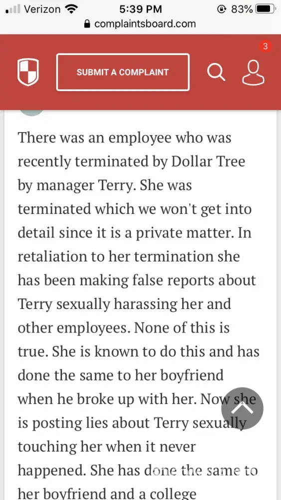 This is mahlia Sampson the head manger at the dollar tree ms Terry has changed my name TAttedupLiaa3kx to TAttedupLiaa3k there is now two complicate board accounts my account TAttedupLiaa3k my account I mahlia Sampson is the one with a picture must I emphasize MINES IS THE ONE WITH THE PICTURE and the one without a picture is the one ms terry made up herself she saw my complaints and changed my name to match my true complaint board account my true account is the one with a picture the other one originally had an x and the end spelled like TAttedupLiaa3kx but now it's TAttedupLiaa3k and now she is trying to make it look like I wrote that statement that said I wanted to tell the truth and that is not me and I did not write that statement my complaint board account is the one with the picture on it the other one without the picture is ms terry who made a fake account with the same complaint board account name as me TAttedupLiaa3k but mine has a picture on it and the other which is me terry's does not and I did not write that statement saying I wanted to tell the truth I was being sexually harassed by ms Terry and I will not stop writing complaints until this issue is resolved she made me feel violated and sexually harassed for 4 whole weeks now until I was fired yesterday she always use to touch me and put her arm around me and try to make me get in the car with her I am telling the honest truth she has made a fake account With the same name as my complaint board account but different is Mae I emphasize mine has a picture above and the other one does not but before the other one had an ex at the end until she seen that I made another complaint and remove the X and try to make it seem like I made two accounts but I did not with the same name as my complaint board account but different is may I emphasize mine has a picture above and the other one does not but before the other one had an X at the end SPELLED LIKE TAttedupLiaa3kx until now she seen that I made false accusation complaint and removed the X at the end and left the 3k spelled the way my true account is spelled but The difference is may I emphasize MINES HAS A PICTURE ABOVE THE OTHER DOES NOT I have a screenshot of the other account before she change the name to match my name and try to make it seem like I Wrote that statement And I did not that was her ms terry making a fake account with my complaint board account name if you go investigate the false report she made you will see that there is two Complaint board accounts THE DIFFERENCE IS MINES HAS A PICTURE ABOVE she changed my name to TAttedupLiaa3k but originally it was TAttedupLiaa3kx and I have a screen shot of where she removed the x at the end and I already have a account that is TAttedupLiaa3k that has a picture above please call me at [protected] I want her fired she sexually violated me and harassed me every shift I had with her I never changed my story about her sexually harassing me she made a account that has the same name as my complaint board account difference is May I emphasize again one more time is that mine has a picture above and she originally had it spelled as TAttedupLiaa3kx but now she changed it to TAttedupLiaa3k and she removed the x at the end my complaint board account which is TAttedupLiaa3k WITH THE PICTURE ABOVE and with 4 multiple complaints I will not stop until this issue is resolved she has been doing very nasty things to me and I feel so dirty and violated please call me [protected]