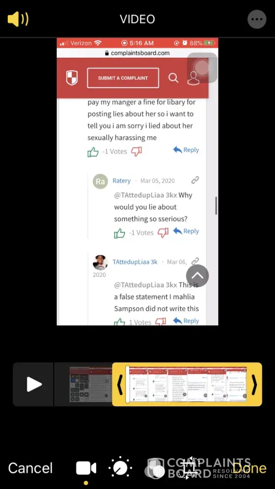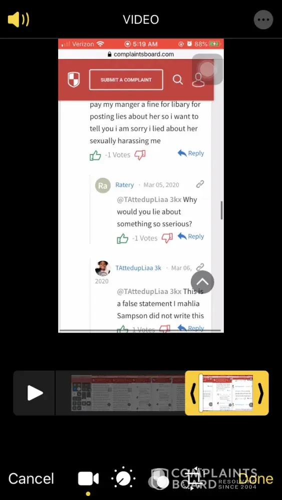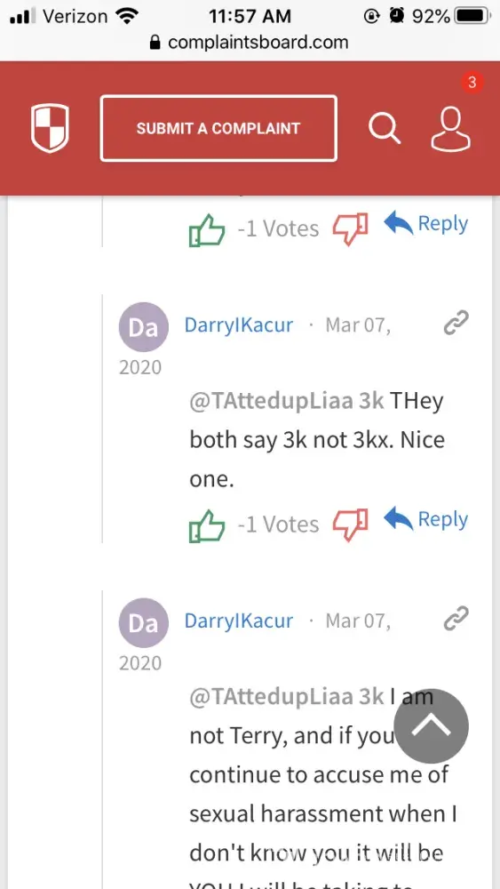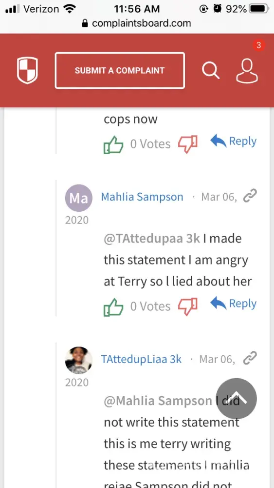 Bruh this is insane me terry keeps using the fake complaint board accounts pretending to be me againnnn I'm am so done with this [censored] the statement below in the picture I did not write ms Terry DID she has a fake complaint board account pretending to be me she keeps changing the name first it was 3kx then TAttedupaa 3k now she has changed it to TAttedupLiaa3k with a different font I'm so damn tired of this and she ms Terry did SEXUALLY HARASS ME SHE DID SHE SHE DID SHE DID and I never lied about anything she did touch me AND please check the cameras bye I'm giving this to god