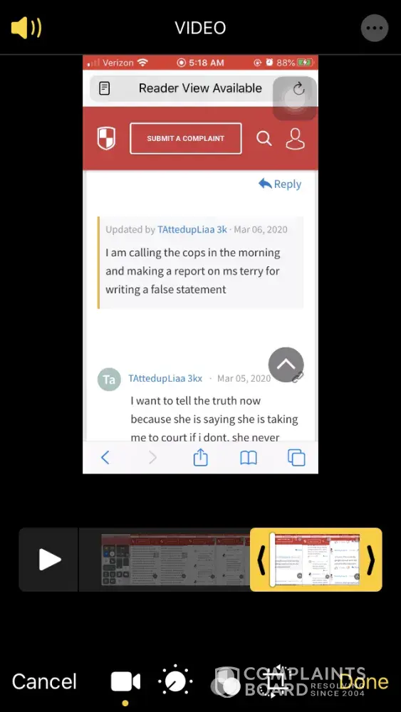 March 6 you ms terry posted that comment and that is not my account that is a fake complaint board account ms Terry has made pretending to be me and I have proof of everything today is March 9 ms Terry you know you are wrong and god knows it to so I’m off this [censored] the cameras will show