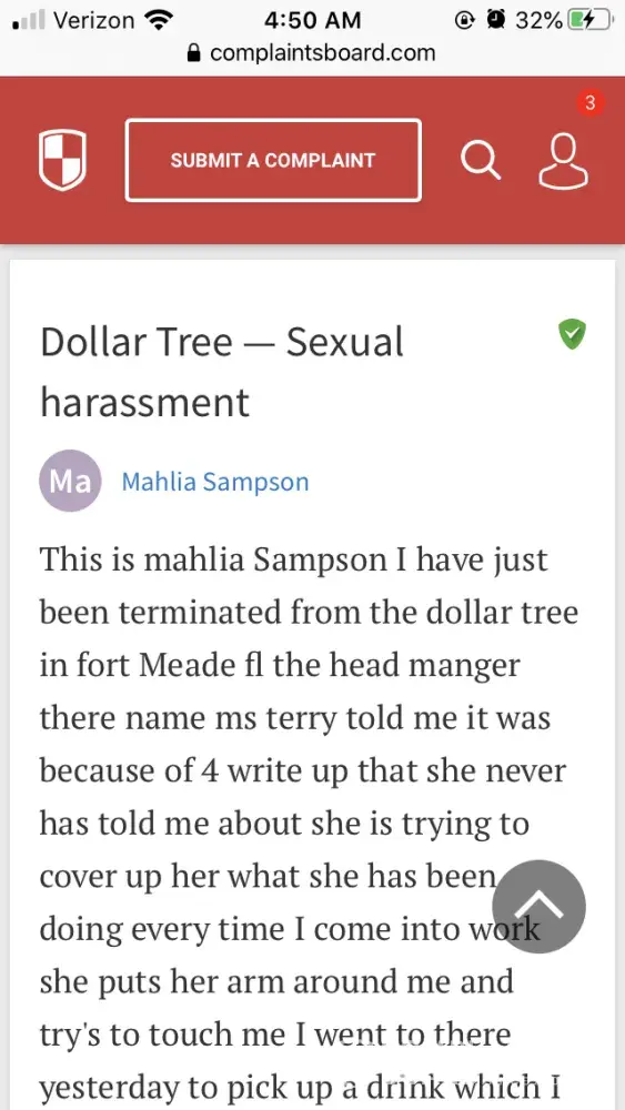 This is mahlia Sampson again making another complaint please look at the cameras at fort Meade dollar tree ms Terry DID sexually harass me and she keeps making fake complaint board accounts pretending to be me trying to cover up what she did to me dollar tree corporate please look at the cameras at fort Meade dollar tree in Florida please