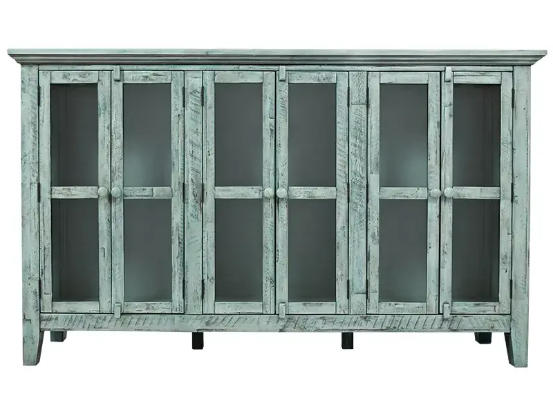 We located the piece of furniture we were interested in, a greenish blue credenza style cabinet. Surfside Accent Cabinet by Jofran 70 x 15 x 42 Product Number [protected]. There were two price tags on the cabinet, one attached to the outside of the glass, the other standing up inside the cabinet. Both price tags were marked with the model name Surfside with different sizes available and prices for each size. The size we wanted to purchase was the 70 x 15 x 42. The price tag attached to the outside of the glass for the size we needed was marked 699 reduced to 599. The price tag standing up inside the cabinet for the size we needed was marked 599 reduced to 499.