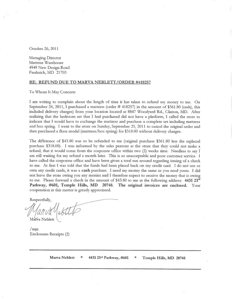 Purchase a mattress on 9/24/2011, paid cash in the amount of $361.80. Later after checking a new bedroom set that I had purchased from another company, I realized that I would also need a box spring. I called the store to cancel that order and informed them that I would be in the next day 9/25/11 to purchase a floor model that came with a mattress and box spring for a lesser amount. The difference was $43.80 that I was told would be refunded by the Corporate Office in Frederick, Md within a week or two. It's now December 1, and I have still not received my refund. I've called numerous times and always get a round around about the checks have not come down from accounting.