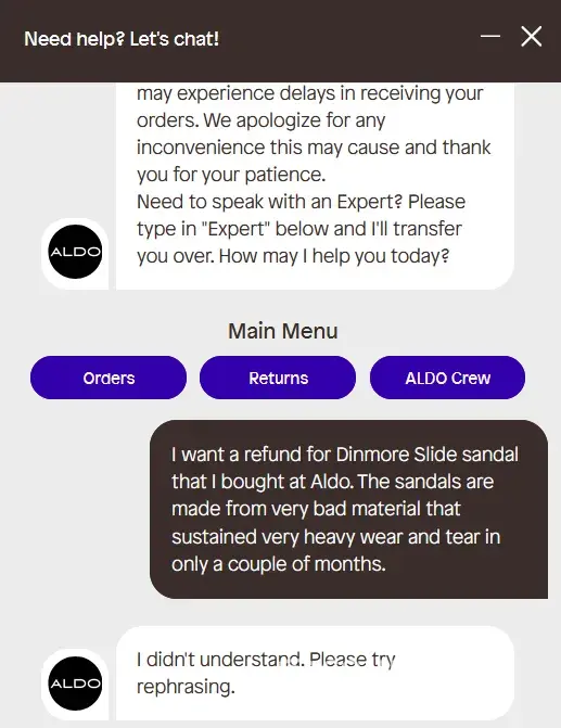 The ALDO Dinmore Sandals are falling apart after just a couple months use. The Aldo online customer care is not inadequate. March 30, 2023