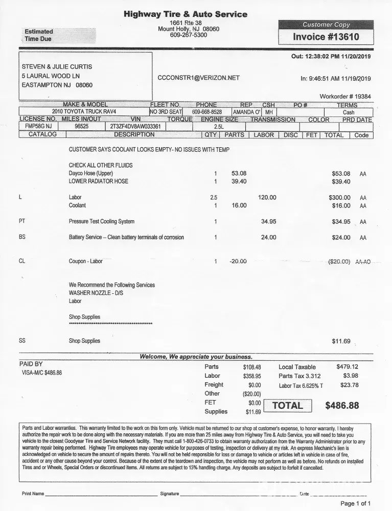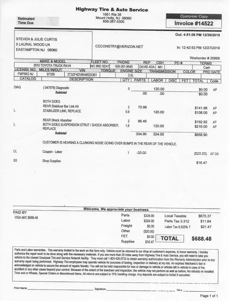 Please see attached invoice, which I unfortunately paid to mechanic for my 2010 Rav 4 with 97339 miles on both November 19, 2019, and, December 30, 2019.
