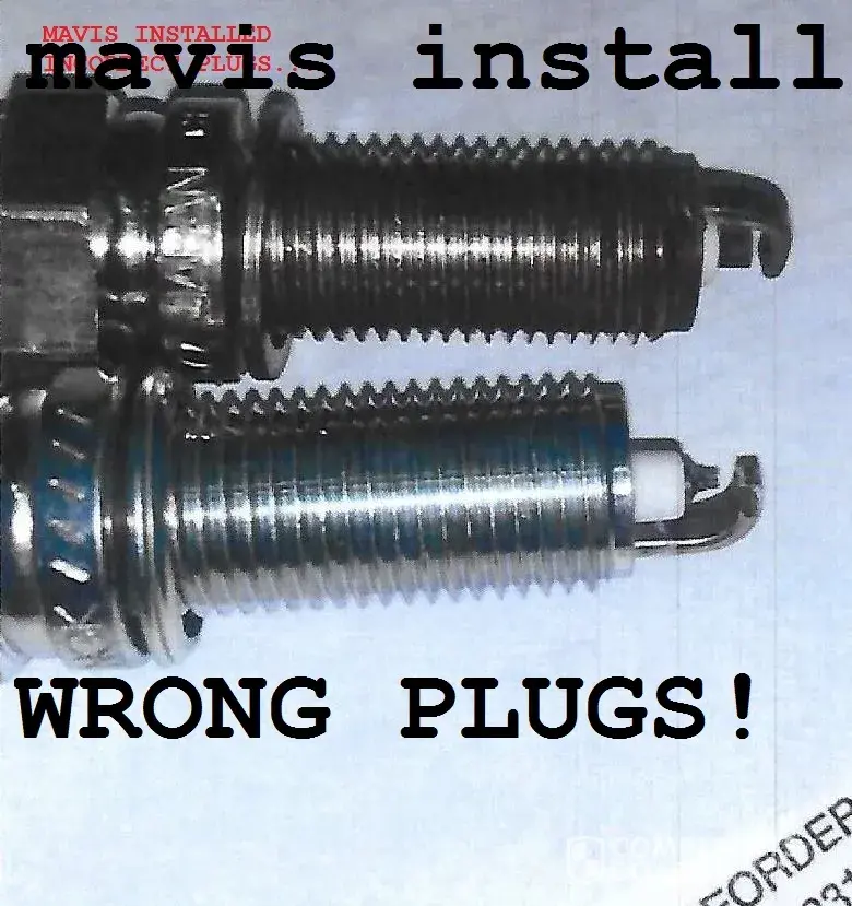 6. I take it back, drive it a day or two hoping the CEL comes on. It does. I take it to Hyundai. They carefully document and photograph along the way and told me Mavis installed four improper plugs. So all that coil swapping and fiddling was for naught, given it would run poorly with the wrong plugs no matter what. I contact Mavis and suggest I also want Mavis to pay for Hyundai having to undo the work they did - makes sense. No luck.