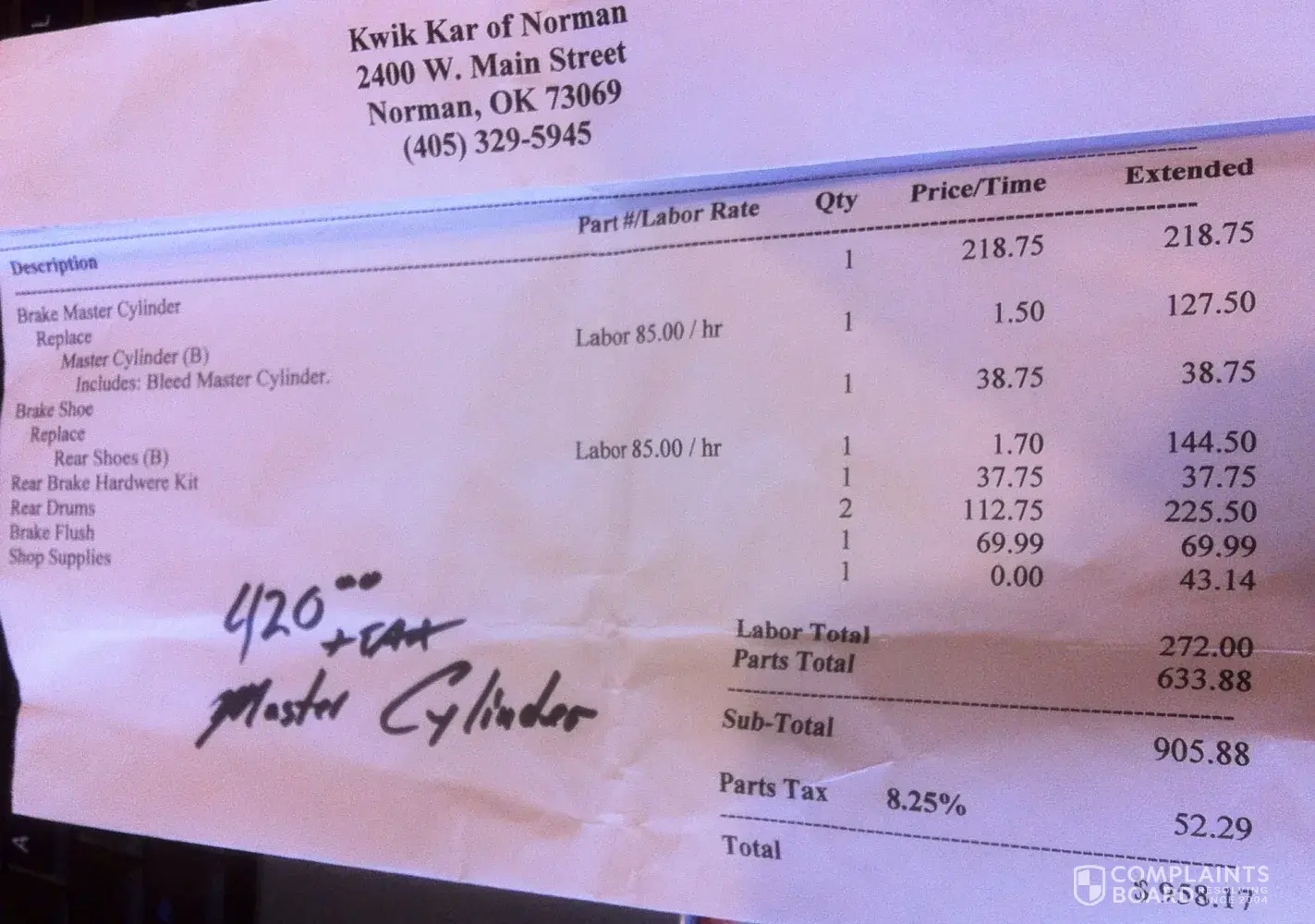 I have been a loyal customer of Kwik Kar for almost 10 years now. When I last got my oil change in Norman they told me my brake pedal was low and I should have it checked. When I took it in later, they quoted me $958.17 in repairs . I later took it to a local repair shop that had been in business for 28 years and received excellent reviews online for a second opinion. They told me after inspection that my brakes were in perfect functioning order and that my rotors looked next to new and were without rust.