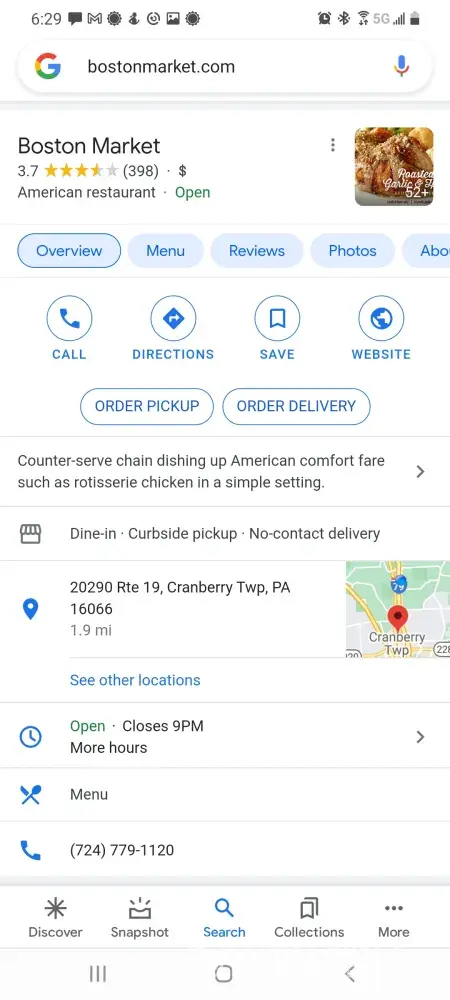 And below is a screenshot of the Boston Market, their hours and website. Thanks.