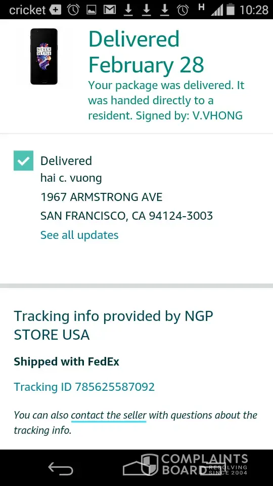 On February 21, 2019, I have bought one plus 5 Android phone from NGP Store USA(order# [protected] and tracking# [protected]) I waited for this item to arrive to my house but nothing came. So then, I filed a claim on March 7, 2019(which was closed) and an appeal on March 22, 2019. I waited until April 8 and they did not get a response from FedEx facility and also case is opened still(case# [protected]). Craig said that he do not know why was it opened when claim is already denied. See attachment. That person that received my package had to be wrong house because my place is not a business. It was trying to deliver to a business place and then on the following day the delivery man stated v. Vhong, who is not my member of residence received this package. No such last name as vhong.