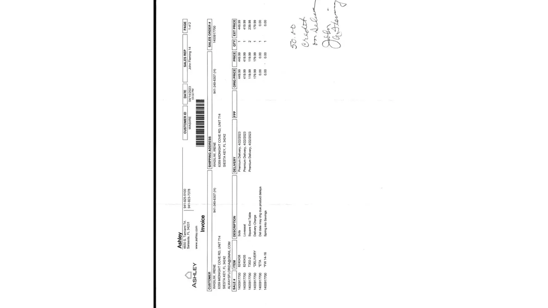 As per attached Ashley invoice, John Fleming indicated under signature that a $50.00 delivery credit plus tax would be processed, and he said that he would do it right away. I also spoke to John Fleming over the phone about not yet receiving the $50.00 delivery charge credit before I left Florida on April 28th.