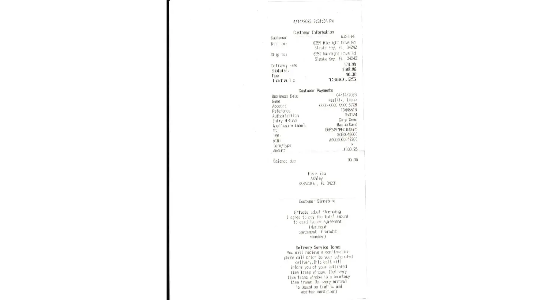 Subject: Ashley Furniture Sales Order [protected]- April 14, 2023, Customer ID:WASIIRE, Irene Wasiliw, 6350 Midnight Cove Road, Unit #714, Siesta Key, FL 34242