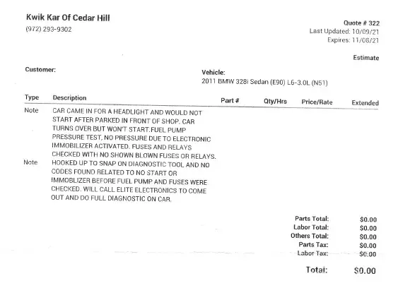 On Saturday, 10/9/21, I took my 2011 BMW 328i to Kwik Kar to have the front right headlight changed out as the indicator came on and notified me that it needed to be changed. I arrived to Kwik Kar in Cedar Hill, TX 525 E Belt Line Rd about 11:45am. James, one of the mechanics came out and asked what he could help me with. I started the car and showed him that the headlight was out and needed to be replaced. He told me that he could get it replaced same day and it would take about 15 minutes to complete. I left the vehicle running, took my other keys off the key ring and got my son out of the vehicle, as James got in the driver side to pull the car into the garage. About 2 minutes later, my son and I are sitting in the waiting area, and James walks in and asks if there was a special way to start the car. I tell him no and go outside to check on the vehicle with him and at this time he tells me that he cannot get the vehicle to start. I then tell him that the car was already running when I left it with him and walked into the building. James was adamant that the car was not running and that it was off. He even mentioned that he has been a mechanic for 15 years. He then tells me that he knew the car was off because he put it in REVERSE and the car would not move. So at this time, he continues to push the start/stop button to try and get the car to start up but its just cranking and not turning over. The manager and three other mechanics come out and look at the car and no one can say what is wrong with the car. Again, I only brought the car in for a simple headlight replacement. The mechanics check under the hood as well as the battery and at first determine that the battery needs to be replaced. Again, a fairly new battery and I have not received any indicator from the car that there was an issue other than the headlight being out. Another mechanic who stated he also owns and has worked on BMWs felt that the issue may be the fuel pump. They run a diagnostic that they state is indicating an issue with the fuel pump. Two of the mechanics, one of them named Bones I believe, pull the backseat out, attempt to start the car and listen to see if the fuel pump is engaging. They do not hear anything which further leads them to believe that the issue is the fuel pump. The two mechanics leave and the manager comes out. While my mother is asking him questions and voicing her concern, he proceeds to tell us that he is not going to argue with us to which no one was arguing but only letting him know that there was no issue other than headlight prior to bringing in the car. He runs his own diagnostic and then states rather rudely to us "do you want to know what is wrong with the car?" He also believes that the issue is the fuel pump. At this point, I agree to have the fuel pump replaced for $650. All the mechanics, manager and now owner are congregated trying to figure out what is wrong with the car. The mechanic Bones comes back out and says that he thinks its the fuel pump but that the Owner is wanting them to test out the security system so he uses the actual key to manually lock/unlock the door and try and reset the car CPU. This still doesnt work. The Owner and mechanics then tell me that they are going to replace the fuel pump because they believe that is what is going on. They stated for us to give them some time and it would be ready later on today, same day (10/9/21). They would have to get the part from a company called Excel or Elite who deal in foreign car parts. The Owner takes down my name and contact information and said he would call when the car was ready to be picked up. My mother, son and I leave the shop waiting on a phone call. No call was ever received. Around 4:15pm 10/9/21, we decide to head back up to the shop since it closes at 5:00p. Once we make it back to the shop, Bones and the owner state that the fuel pump was not the issue and after further running diagnostics, checking all the fuses and testing the fuel pump, they determined that there was no issue with the vehicle. The owner then states that he believes the issue is that the car immobilizer (or anti-theft device) was activated. I then proceed to ask for clarification, to which I ask did the mechanic putting the car in reverse without the car being on cause this activation and he stated that he did think that was what caused it but that there is a possibility that that is also not the issue. The Owner then proceeds to say that they have a company they work with, Elite Electronics (I believe) who would be able to come out and reset the car CPU and run a full diagnostic but they would not be able to contact them until Monday and hopefully get them to come look at the car by Tuesday, 10/12/21.