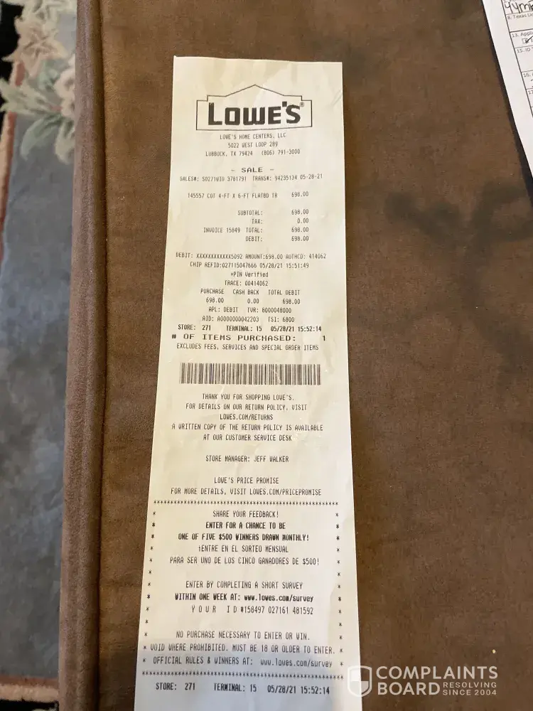I bought a trailer 4 x6 ft flatbed from Lowe's on 05/28/21. After I paid the cashier called someone to take me to get the trailer. Someone said no, she has to fill out papers do I was directed to the customer service. Another young person tried to do the paperwork had to call another for help. I was giving the first paper I will submit as that paper.