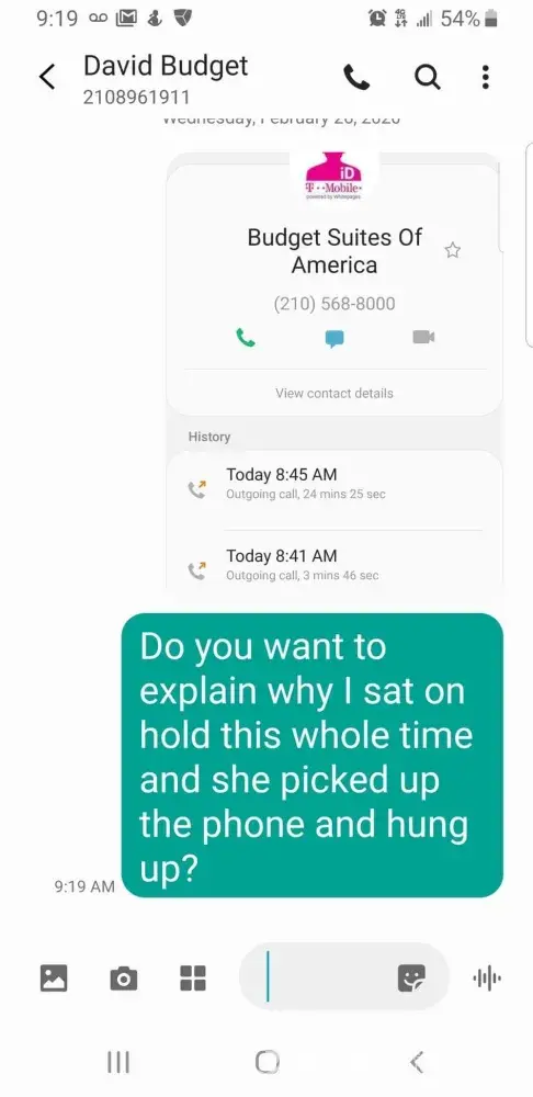 I have called the office countess time over a course of a year and complained about the noise upstairs. The person living above me is an employee of this facility. So when I call the front office I get "I will text her". Which just further pisses her off and she gets louder. I have sent several emails to sanantonio@budgetsuites.com and I have gotten zero response. I just sat on hold for 24 minutes and 25 seconds. Gayle is the one who put me on hold. She hung up on me exactly at that time. She just picked it up and hung up. I confronted David and he told me while I was on hold that while I was on hold she had 3 people in the office at the time. First of all is it protocol to just leave your customers on hold that long? Second, should you be answering the phone in between? Third hanging up without even speaking to me? Something needs to be done. I am so tired of this bull. I pay full price for my place and I have been here for 4 years and dealt with the price hike several times. I am told to remove things from my windows from the front of my place but the same rules do not apply to their employees. I have had to deal with her confronting me aggressively in front of my place and in front of the front office. I have even been told the my folding chairs in front of my house are a fire hazard when in fact they break zero codes. I have called the Fire Chief, Building Code inspector and others. They all say the same thing. my chairs do not break any laws or regulations. Yet I went along with it but my upstairs neighbor can do what they want. I need someone to call me [protected]
