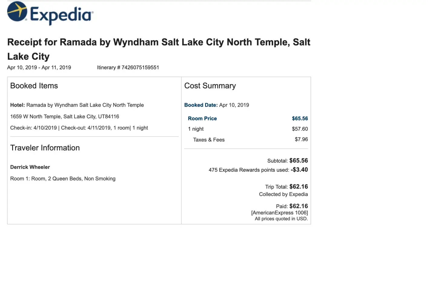 On 10 April, 2019 My husband was at the Ramada Inn, 1659 W North Temple, Salt Lake City, UT 84116. I made reservations for a room for him. ( itinerary #[protected] for $65) The desk clerk told him to give him $100.00 deposit and it will be returned in the morning. My husband asked for a receipt. The clerk stated that he was going to give it back, via email. He said he didn't understand why we could not have a paper receipt. Not so sure, my husband asked me to talk to the clerk and get clarification, the clerk told me that I was calling him a crook. I was not doing such a thing, I just wanted him to explain to me how the process worked. Meanwhile, my husband gave him the $100. in cash. (he as tired and ready to go to his room)The clerk shouted and said that he was not going to rent the room and he had to leave. My husband asked for the money back and he took $20 and put it in his pocket and gave him $80 dollars back. We asked for our money back since he refused to give him the room and he said no. I had Expedia on the phone while this was going on and they said they could do nothing about it. In our 30 years of traveling and being in the military we have traveled we have never been treated in such a disrespectful way and have money just taken because the clerk was not honest. Talking to the Expedia representative he said it was best to just file a complaint. My husband is a CDL driver and the school sends students there on a regular basis. At the time we didn't need this added loss.