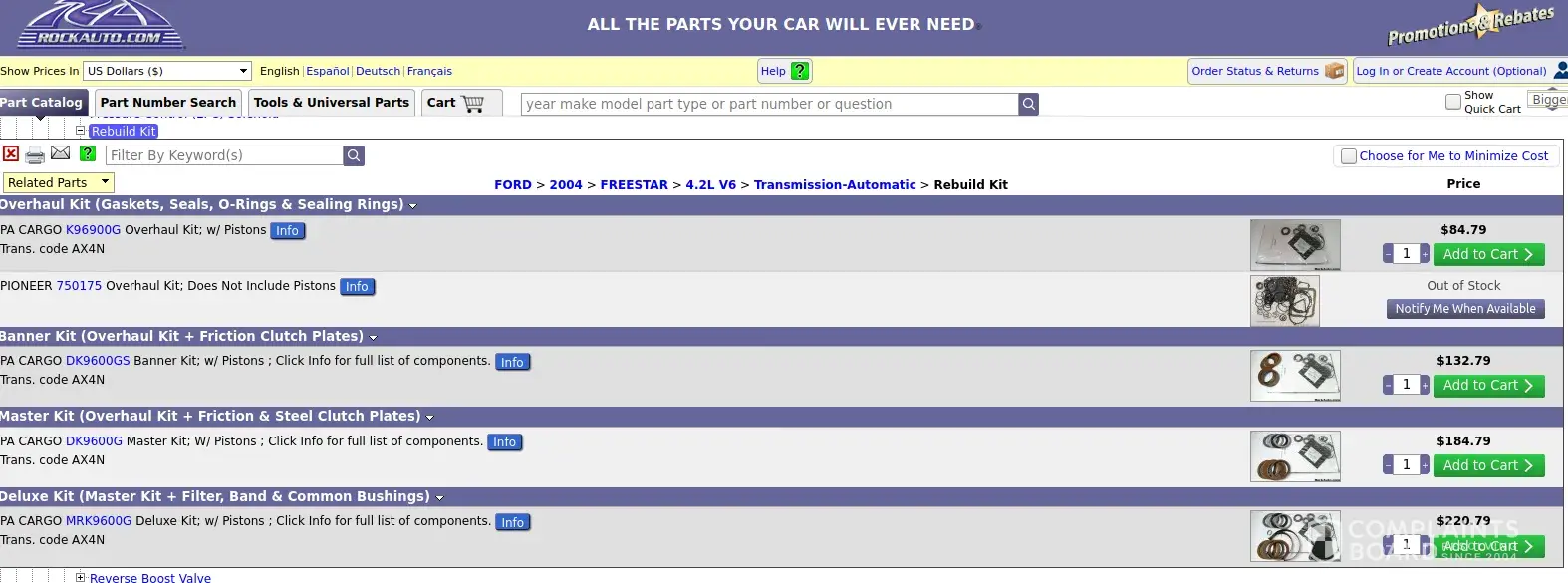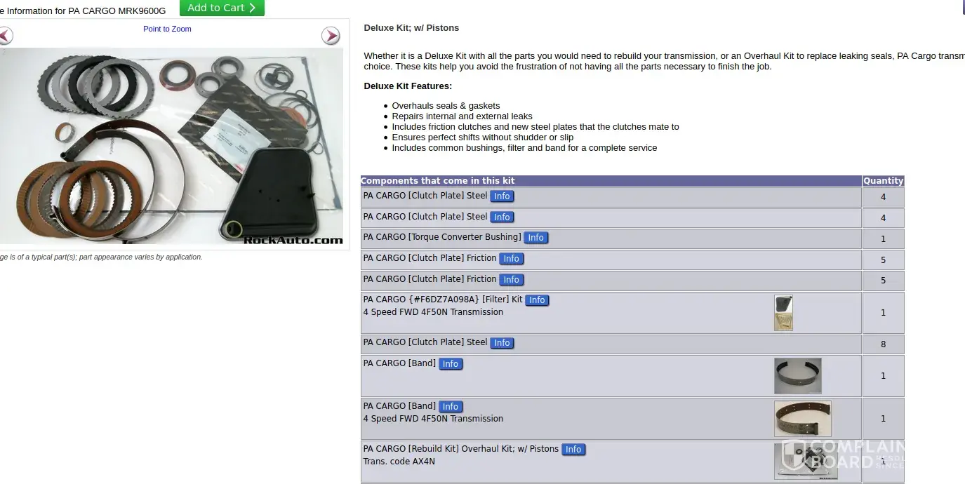11-17-2020 order #159512648 PA Cargo MRK9600G rebuild kit w/pistons. The kit I received has no pistons. This rebuild kit is listed in there catalogue with pistons and they are missing. they refuse to make my order right. I've included screenshots from there catalogue to show what I ordered and how it is listed. This rebuild kit is for a 2004 Ford Freestar 4.2L engine. Not to mention that Deluxe Master transmission rebuild kits are as complete as possible, this is an industry standard.