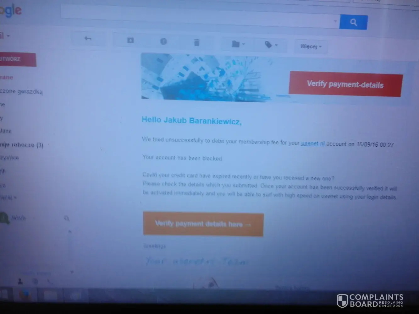 I write from Poland (so, my english may be poor, sorry). My full name Is Jakub Barankiewicz. I registrate on service usenet.nl to download one book. I didn't download it, because they don't have it. I cancelled my account on 2 september 2016. A few days later they send to me e-mail with assigment to pay 100 euros. I don't have this money. Do you help me to disengage from them?