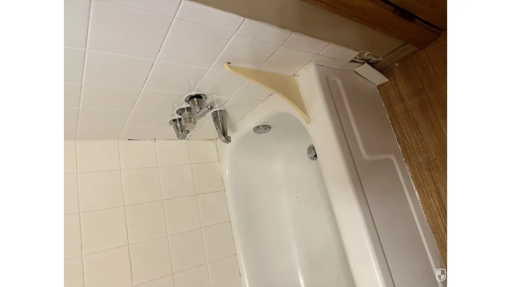 A tile from the bathroom is just laying on the floor behind the bathroom door.