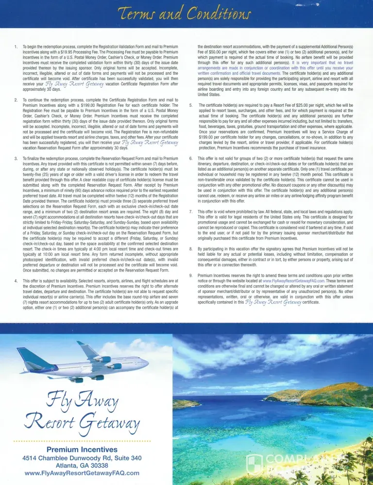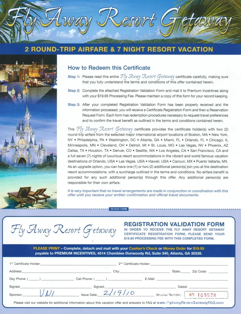 The Vacation: Not Free - You have to send in a regstration card with $19.95, wait for the response then send in $398 for the travel certificates to cover fees. All fees must be paid by Money Order or Cashiers Check. When you send in the $398 there is no guarantee of where you will go or if your dates will be available (you have to submit 3 sets of dates not within 7 days of a national holiday). When your dates are accepted then you are sent your tickets and confirmation - btw, you have to pay $25 per night to cover Taxes, Gratuities and Surcharges. Total is almost $600 (not bad for 2 with airfare & 7 nights) but I don't know if I'm willing to send a money order or cashiers check to find out I'm scammed.