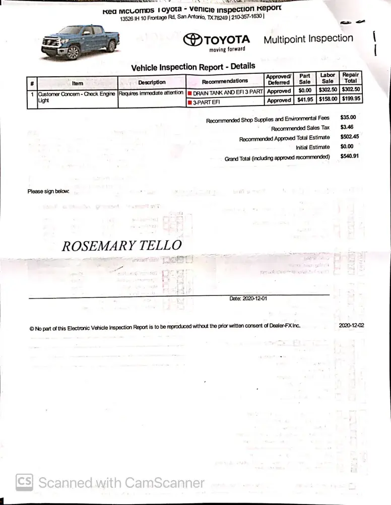 Filled up a full tank of regular grade gasoline on Sunday 11/22 at the Circle K location #27421 at 841 Bitters Rd. San Antonio, TX. Used card number ending in 2818 for charge of $34.63. For the rest of the week while starting my engine, it would sputter and rev unprovoked. It seemed unusual but I ignored it until 12/1 when the truck completely shut off...
