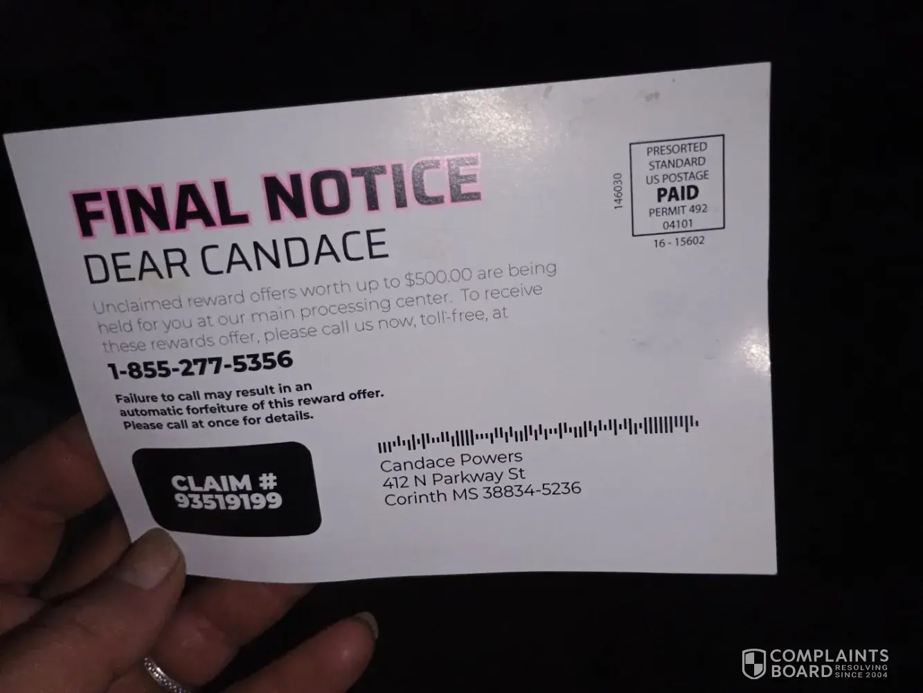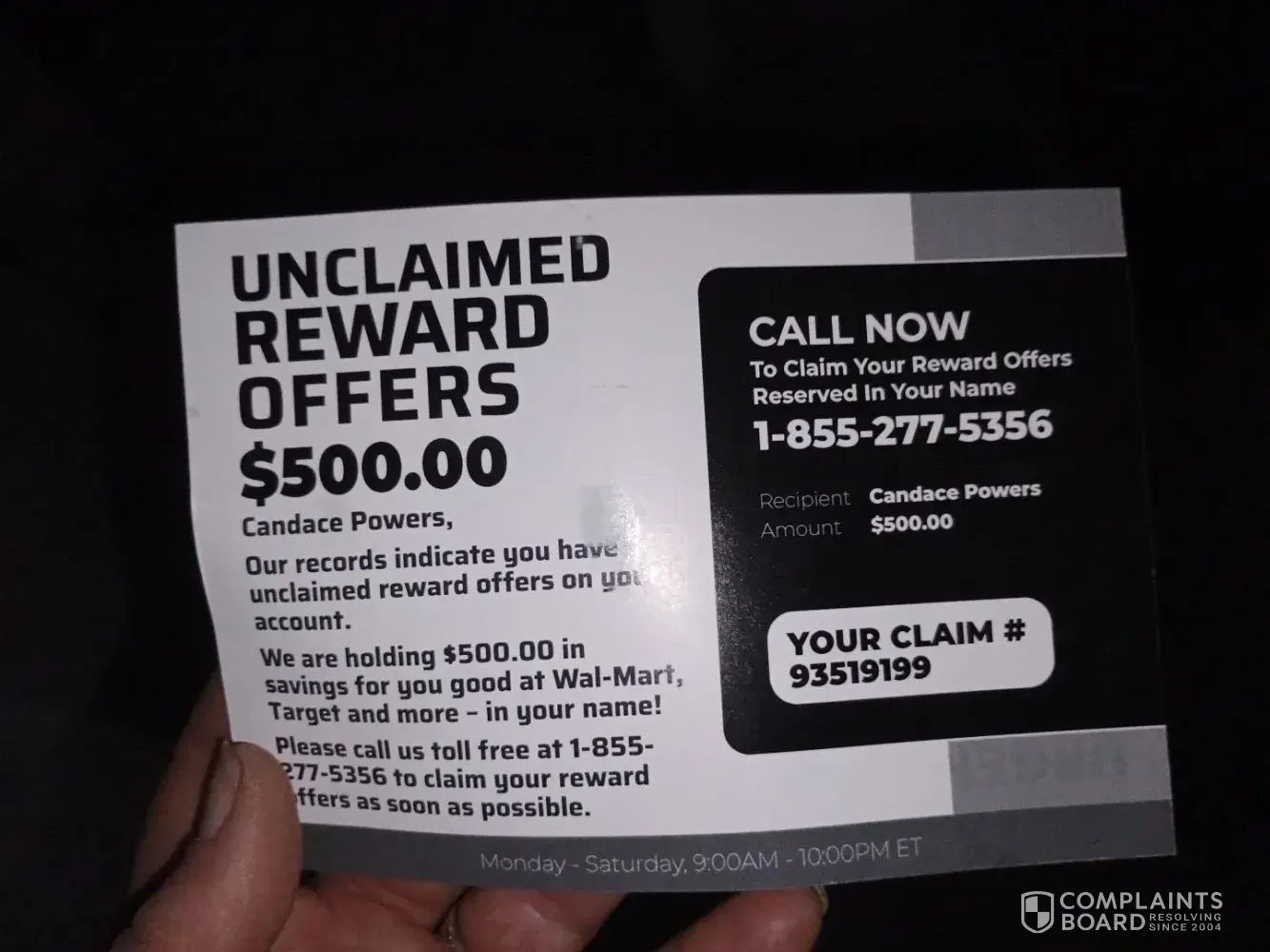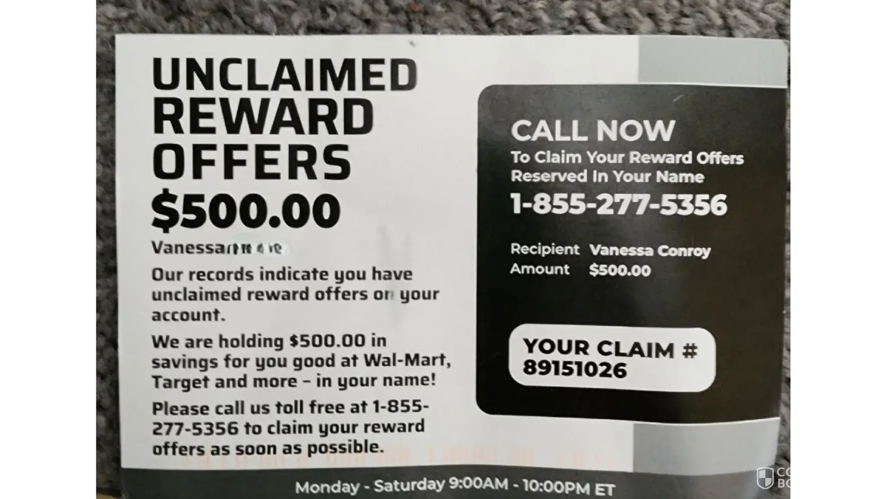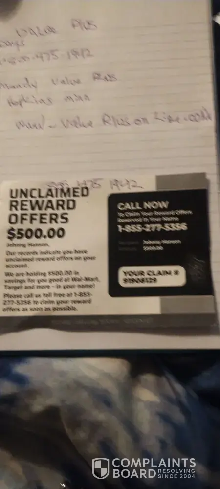 Tuesday September 5th 2023 I received a postcard saying "unclaimed rewards offer 500.00 in savings for you good at Walmart/Target and more. Please call now [protected] mon-fri 9am to 10pm ET. " on the other side it says "FINAL NOTICE" I called the number and Jennifer asked me for my 8 digit claim number on the card and says my full name and I say what...