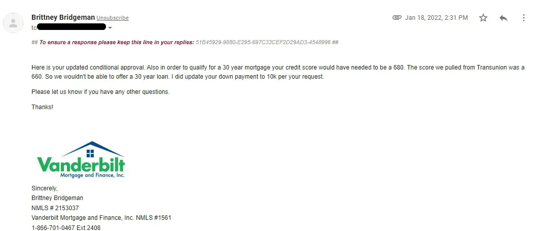 On January 18, Brittney Bridgeman wrote: "Here is your updated conditional approval. Also in order to qualify for a 30 year mortgage your credit score would have needed to be a 680. The score we pulled from Transunion was a 660. So we wouldn't be able to offer a 30 year loan."
