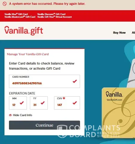 I purchased several Vanilla Visa Giftcards in the amount of $700.00 at a local party city in Rancho Cucamonga, CA. The giftcards were intended for a work birthday gift. When the receipent received the giftcards and wanted to use them, she wasn't able to. It stated "system error". Her and I contacted Vanilla Giftcard to start a case on the cards which wa...