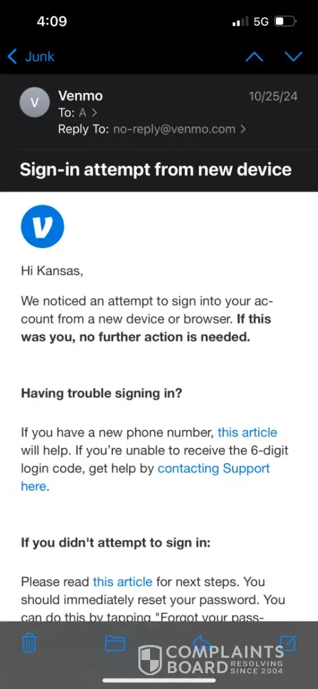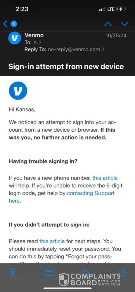By way of a brief background, at 6:48 Friday, she got an email (no text, no call) saying someone was trying to get into her account from an unregistered device. She was not on her email or her phone because she was at work so she did not see this. Within ONE minute (email also time stamped at 6:48), she received another email saying that an instant transfer from her account was completed...to a totally new bank account that the hacker had JUST added. NO FLAGS on Venmo's part. NO temporary freezing of her account to verify the authenticity of the transaction. NOTHING.