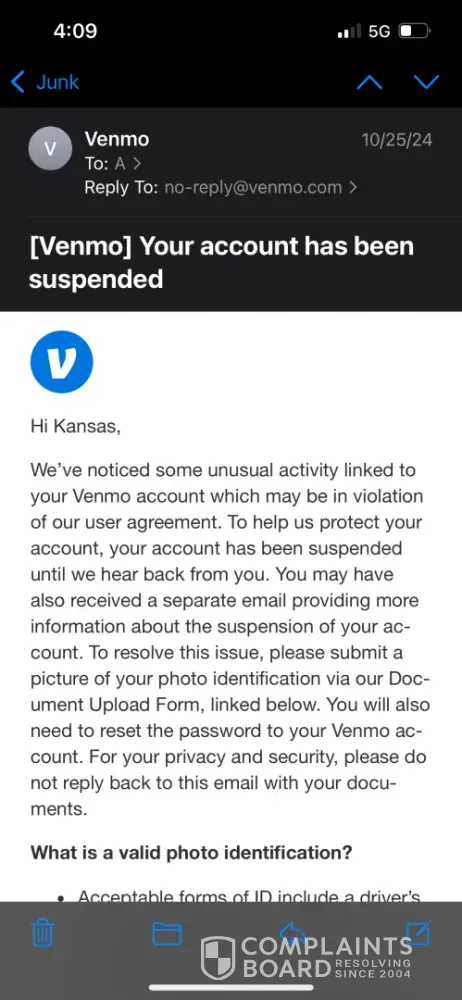 âï¸ Update: I posted on my Facebook account and here on reviews about how awful this company’s practices were, and warning all my family and friends (I have a lot of them), low and behold the next morning not even 24 hours later around 6:00am on a Saturday, I receive an email from Venmo Account support notifying me that my account is deactivated because of activity that went against their user agreement “that puts me and others at risk for fraudulent payments†odd seeing as how I only use it to send my uncle, and husband money, and to buy LEGAL things with. BTW the account support is usually not there on weekends, but Marcus Z. Made sure to notify me of the decision he has made. I am completely okay with them deactivating my account, I don’t want the worry of them freezing my account out of nowhere hanging over my head, and the fact that if anything happens with your account and not being able to get in touch with an actual representative that can help in any way. My friends and family are going ahead and closing their accounts too because they no longer feel safe using this money service. I will be sure to let anyone I meet know what happened to me and how they handled it. Never been so disappointed with a company enough to write this kind of review. USER BEWARE!