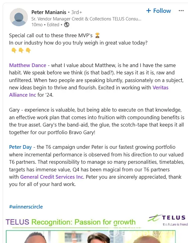 I received a email from MATTHEW DANCE of Veritas Alliance Inc of Toronto, Ontario regarding a supposed outstanding debt. This was the first communication from this person with the pertaining company. TELUS HAS A T6 CAMPAIGN, 3 teams to collect and acting separately. HERE, in the image they are bragging.. They are claiming I have a telus bill from 2 year...