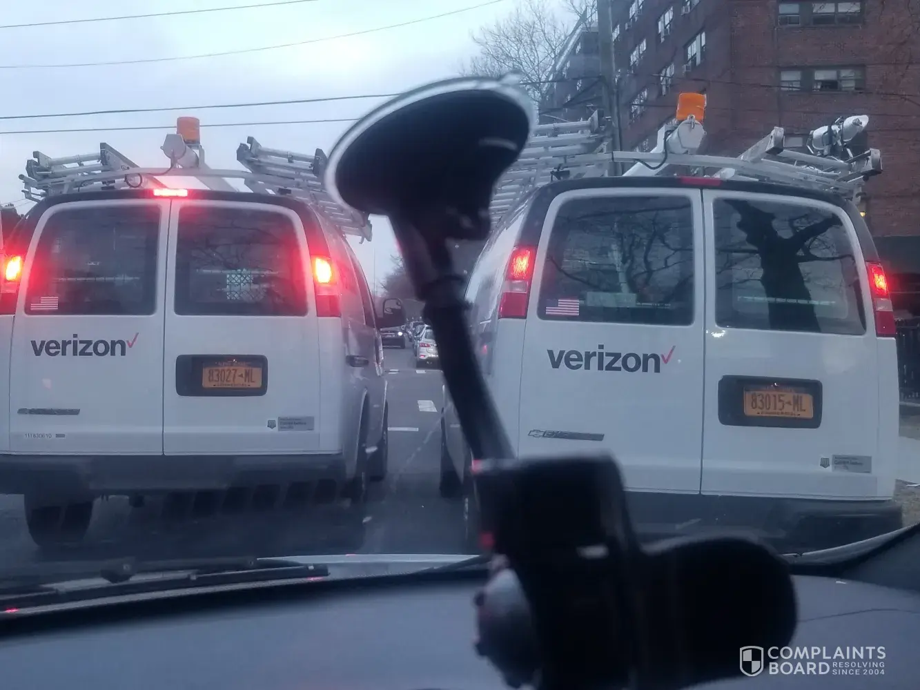 Two of your Service Technicians have been double parked for the past half hour in a very busy intersection located at 893 Schenck Avenue and almost caused someone to hit my car because they are busy bull crapping while double parked. Thats not cool and its also dangerous to me and other people in the neighborhood. The three photos is me in my car trying to get around them and they dont care that people are honking. The video I video once I got out of my car and went inside my apartment building and they started to leave.