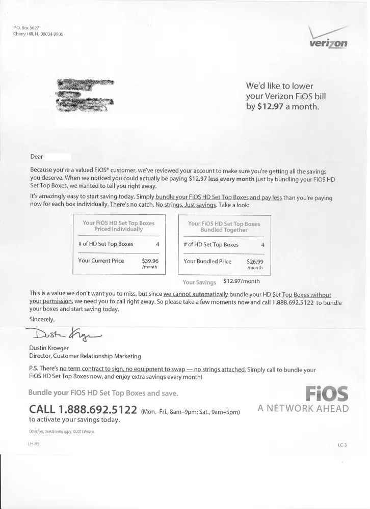 Letter received today. I called the number listed and asked to have my 4 set top boxes 'bundled' so that I can save the promised $12.97 per month. The lady at Verizon asked me if I had the DVR. I told her I did not. She then explained that I would not be eligible for the savings unless I had the DVR service. I told her I didn't want the DVR service and pointed out that the letter clearly stated twice that there were no strings attached. It was even underlined: There's no catch. No Strings. Just Savings.