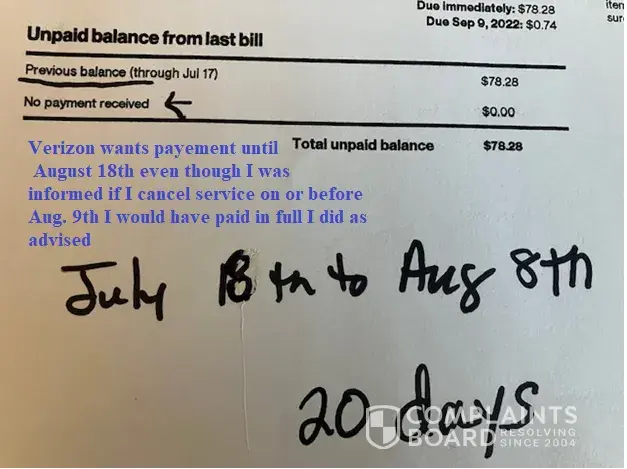 In late July I called Verizon to make certain that if I left on what day would that need to be whereby I would not owe any money nor would need or expect [if they did] a reimbursement; thus, no overpayment. I made two calls to two representatives to make sure I heard correctly, and that the representative was correct. They assured me if I left on or before August 9, 2022, the way they stated the billing cycle was structured, I would have fulfilled my obligation as that was around the rollover date. I did as he stated, and shockingly I started getting emails stating I owed for August but apparently Verizon wanted me to pay for the entire month of August.