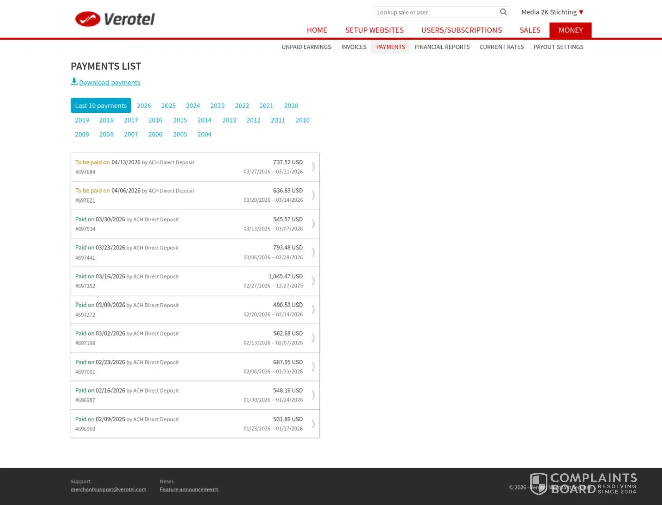 Verotel Merchant Services / VTSUP.com review: Payouts