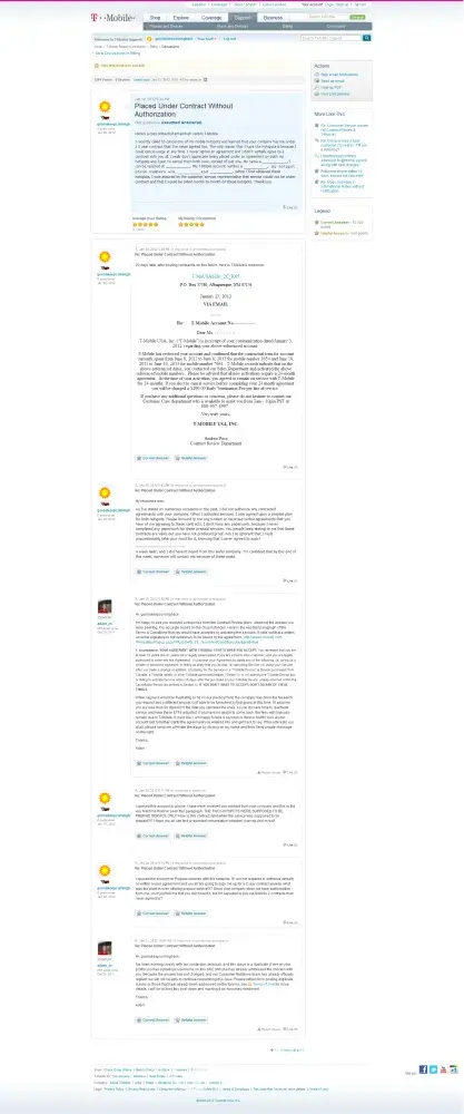 T-Mobile maintains that my contracts are valid, although I never verbally or by written agreement, agreed to such contracts. I have attached copies of correspondence. The first forum complaint was completely deleted by T-Mobile, so I opened another support forum account and initiated another complaint.