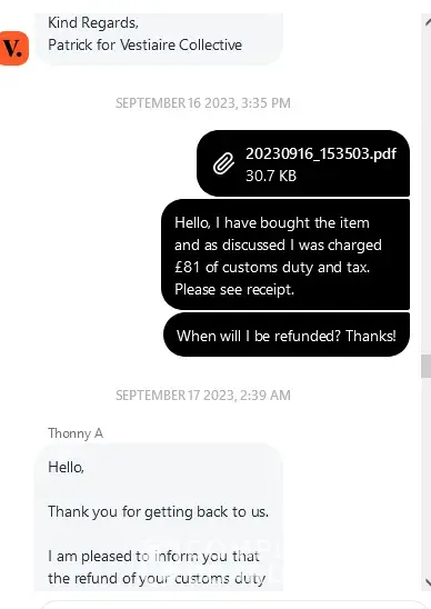 I trust that Vestiaire Collective will take prompt and appropriate action to address this issue and restore confidence in its platform. I eagerly await a favorable resolution and request timely communication regarding the progress of this matter.