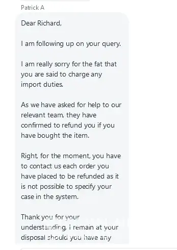 I live in Northern Ireland which after Brexit is still in the single EU market for free trade of goods within the EU. Prior to making a purchase, in an online chat with this company (13th Sept 2023) they confirmed that when I make a purchase and import duties are charged I am to contact them through their email system to request the refund of import...