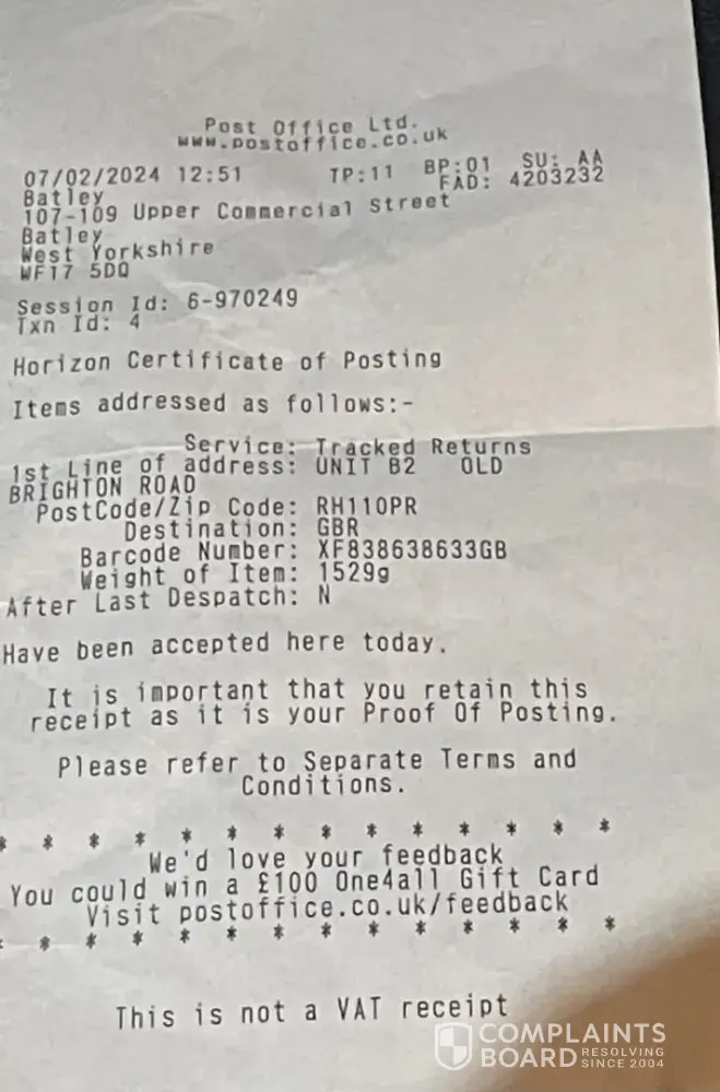 I sent an item on a prepaid delivery note with Royal Mail tracking number XF838638633GB, usually as soon as the item is sent it’s updated as shipped on the sale made but on this occasion it didn’t show as shipped. I contacted customer service online and they asked me to check back in 48 hours in the mean time on 9th February the item showed as delivered to Vestiare at the Uk site in Crawley but still nothing updated. Since I have been in contact with customer service and they are not providing an update, I am very concerned as I sent this item that I’m expecting £290 for but on the system it shows as I haven’t shipped and it states if not shipped by the 13th the order will be cancelled. Vestiare are not processing any explanation and now have said I didn’t send on the prepaid shipping note provided and that’s why it’s taking a while to update. However that is not the case I have provided a receipt to show I used their prepaid shipping note.
