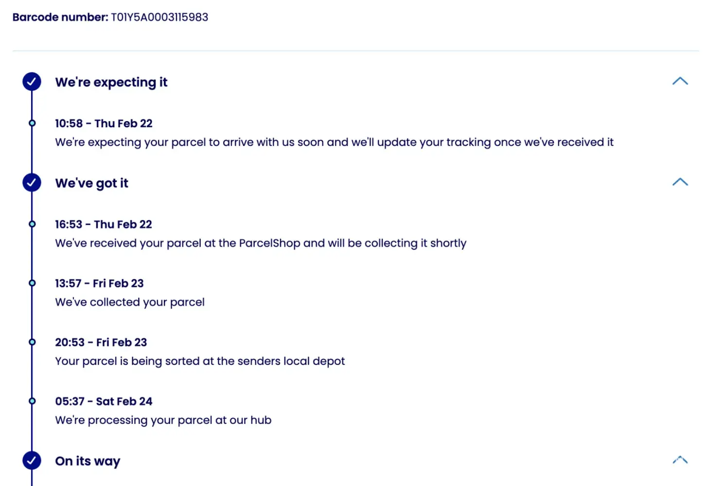 According to the provided tracking information, the item was successfully delivered on 26th February 2024.