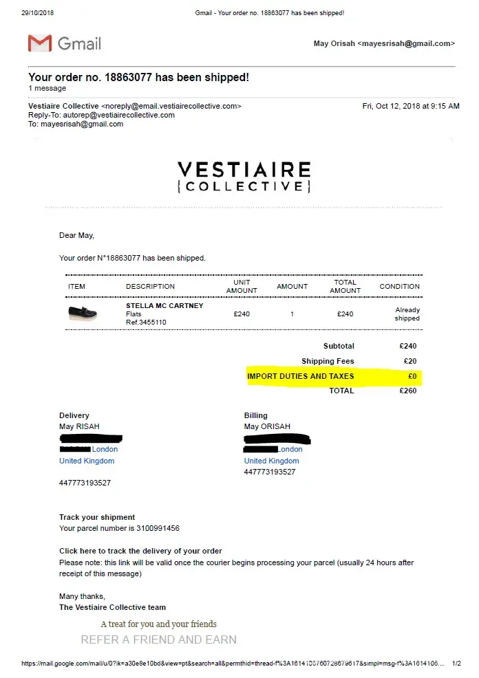 I purchased a pair of used Stella McCartney Binx loafers for £240 on 09/10/2018 (Ref 1886307). The website provided the option of £20 shipping fees as flat rate and advised the item would be shipped from Hong Kong to Paris for Quality Control then shipped to London from London. I also received an email which stated I had free shipping offer which would end on 12/10/2018 but this was incorrect as I was charged £20 upon checkout. I was not given the option to choose to pay the flat rate or import duty tax instead.