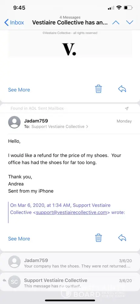 I purchased a faulty item from Vestiaire Collective and upon receipt of the items the shoes were dirty and had pen marks on them that were not included in the listing. I emailed them on 11/06. "I purchased three items under [protected] and two of them are not as expected. The shoes are dirty/more worn than the description and the dress shows signs of fade on the colourblock area? I've ordered from Vestiaire a number of times and never had problems like this. Can you please let me know what my options are? The items are still in their packaging with the tags attached."
