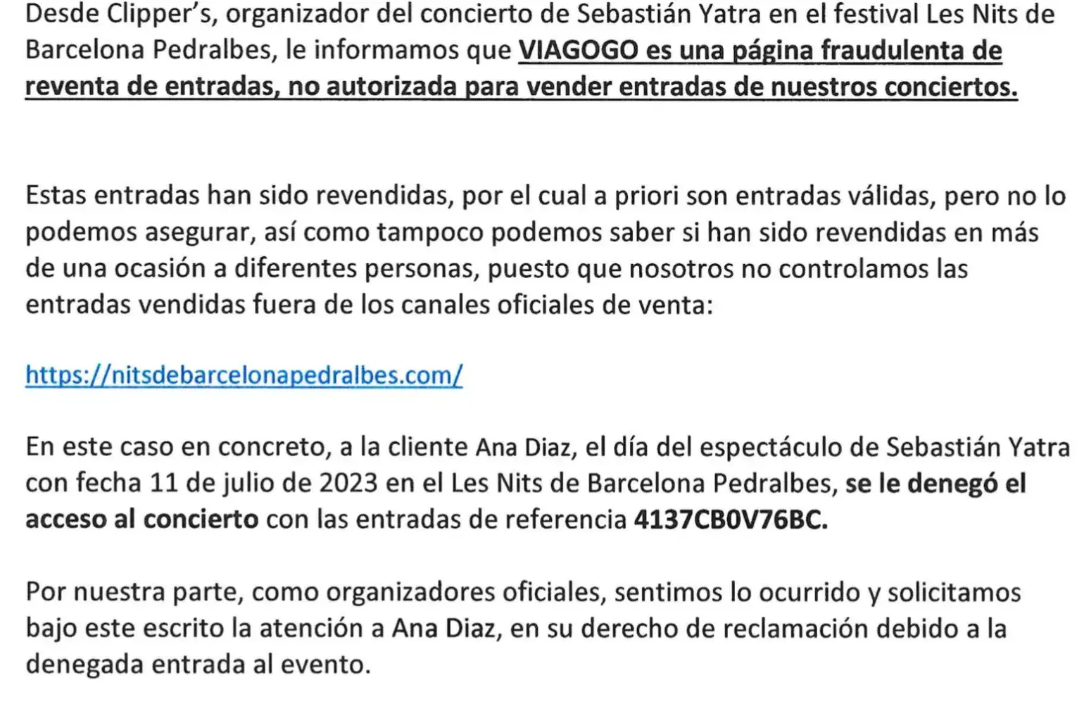 Fraudulent sell to sebastian yatra tickets to a concert in Barcelona