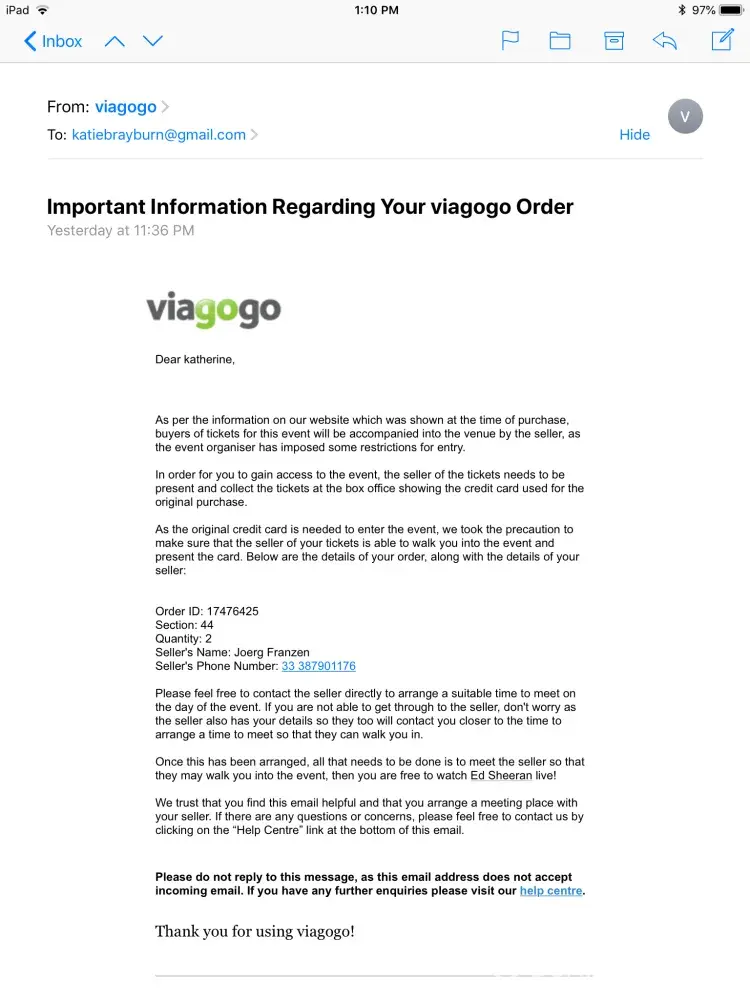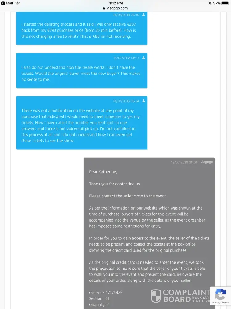 I sent multiple emails to Viagogo's customer service and received confusing responses. A number of my inquires were not attended to.