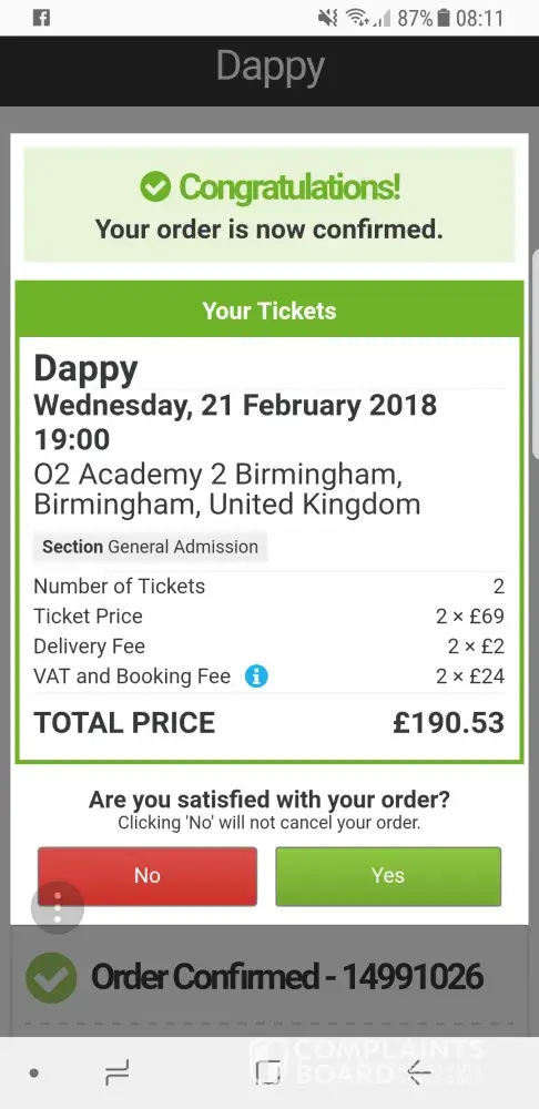 Under pressure to get tickets for my daughter for Dodie concert in Belfast instead of going directly to venue i went on this website. I was additionally charged 100 pounds for tickets that were available from venue. They use high pressure tactics, and no clear costing of booking fees and delivery charges. Outrageous! Feel totally scammed by an unethnical company and hope that others do not have to have the same expereince.