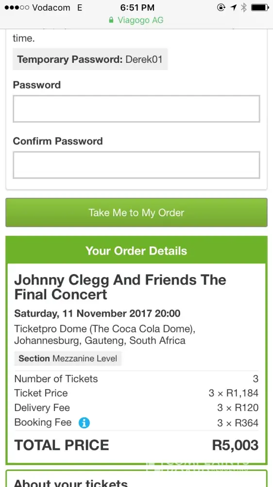 When I googled Johnny Clegg, the viagogo site defaulted as the site of choice. I'd never been on the site but be that as it may, I continued. I was alarmed at the price of the tickets but he is an artist Im extremely keen on seeing. But to make matters worse, on top of the extortionate ticket price, I was charged for a delivery fee and a booking fee. Who in this day and age charges a delivery fee when tickets can be printed at home? I then began sensing that something was untoward. A couple days of the booking, I logged onto the viagogo website to cancel my tickets only to see that I would lose a further R2000. I was in shock as this is surely uncompetitive and I should perhaps seek to bring this up with the Consumer Protection Act ombudsman.