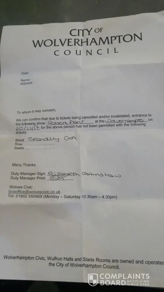 I gave you the addres of the hotel to send me the tickets. At saturday the tickets sent the hotel without name about the package! Because of that the hotel refused to get the tickets, sinc than looking for this tickets about three days! We send to Royal mail, we went Post Office, we wait at the reception five hours about your calling! (after I talked with you about 10 times at the phone and told you about this case). And finally you didn't give me a solution and told me you give me back the money! I rented a car to arrive wolverhamton, I ordered nights at wolverhampton and at Birmingam only for this concert! I drove about 4 hours from London with hope someone can help me, but it didn't happend, because your falt! I invited all this vication because this concert, and you destroyed all of my viation!