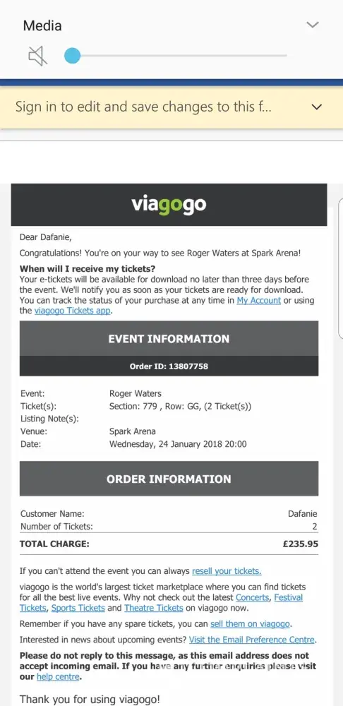 Hi we brought tickets for the roger waters tour in new zealand my grandmother is a very big fan and wanted to see her favourite person one more time as her last time was when roger did a show in auckland (Under the moon) my grandmother saw their were tickets available and went on the internet and brought from viagogo after doing so and not receiving her tickets she watched a show on tv explaining how lots of people are basically being conned out of there hard earned money in the belief they would get tickets for there favourite shows i'm writing to you to see if there can be a good outcome for my grandmother who brought the tickets with her pension to see here favourite lead singer one more time could we please either get the tickets sent out straight away or get her money back