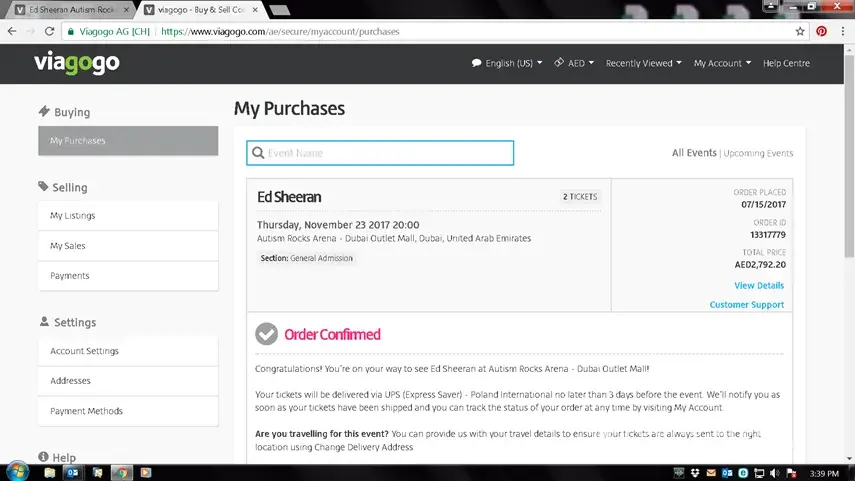 I purchase 2 Ed Shereen tickets for AED 2792 order no. [protected] dated 15th July 2017 and now i find that the same tickets are being sold at AED 1408. Screen shots are attached. I wish to have refund for the balance money as you cannot cheat a client by changing prices for the same show and on the same website.