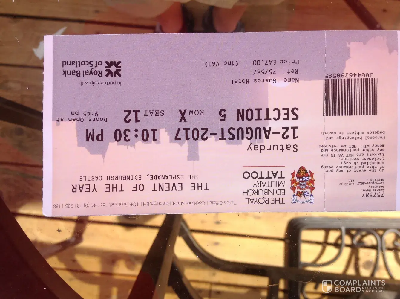 My friends and I purchased tickets for the Tatoo. What we thought to be the official site of the Tatoo was actually Viagogo. They sold us tickets that cost 47 pounds for 125 USD! I had been to Tatoo and had a wonderful seat for 1/2 that price so when I saw the price of the tickets I thought. We would for sure be in the highly regarded red seats below the announcer. We had to pick up our tickets at the Apex Hotel 1hour prior to the event which was also odd. I failed to look over the tickets and just got in the queue with the hundreds of others for the event. When we had to to go row X I knew something was wrong. According to Tatoo we were lucky to even get in the event. We are going after these Sons of b's because of the unethical and hopefully illegal business they are operating